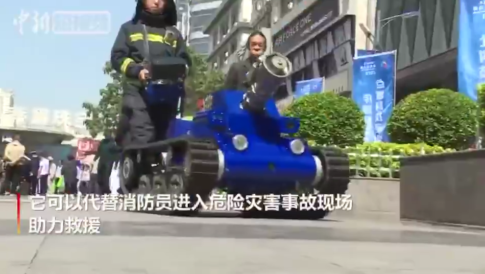 消防机器人可以代替消防员进入危险的灾害事故现场,助理救援行动,大大减少人员伤亡,降低人民生命财产损失。(图为务进智能消防机器人走上街头)