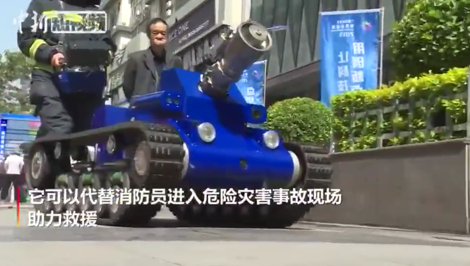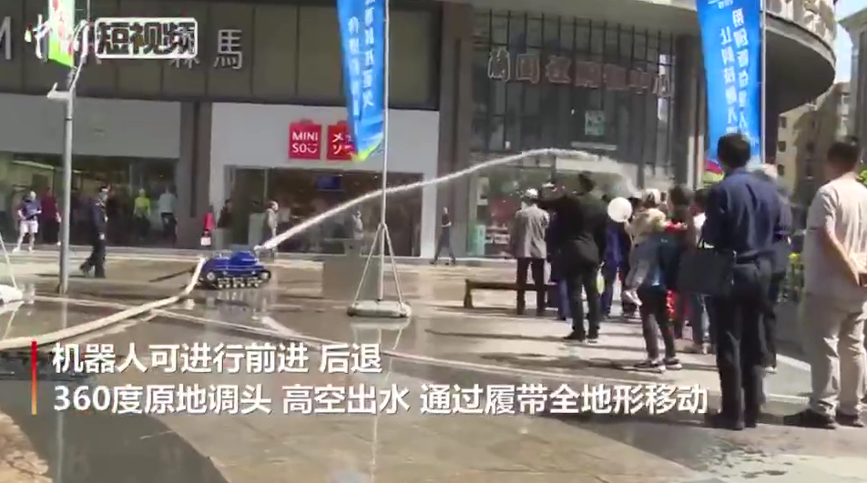 消防机器人,可以远程操控,实时管理,极大地方便广大消防官兵救火救灾。(图为务进智能消防机器人走上街头)